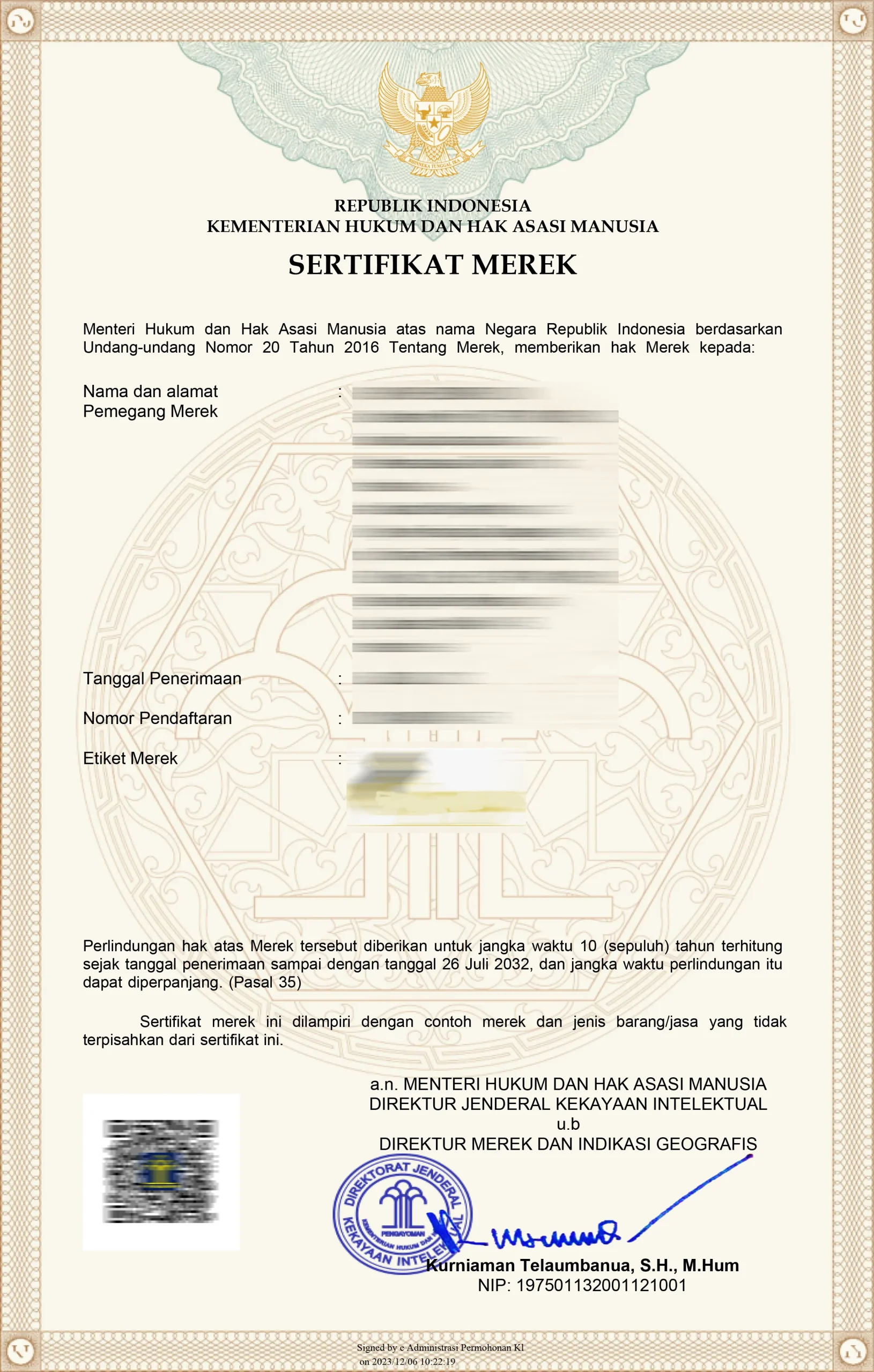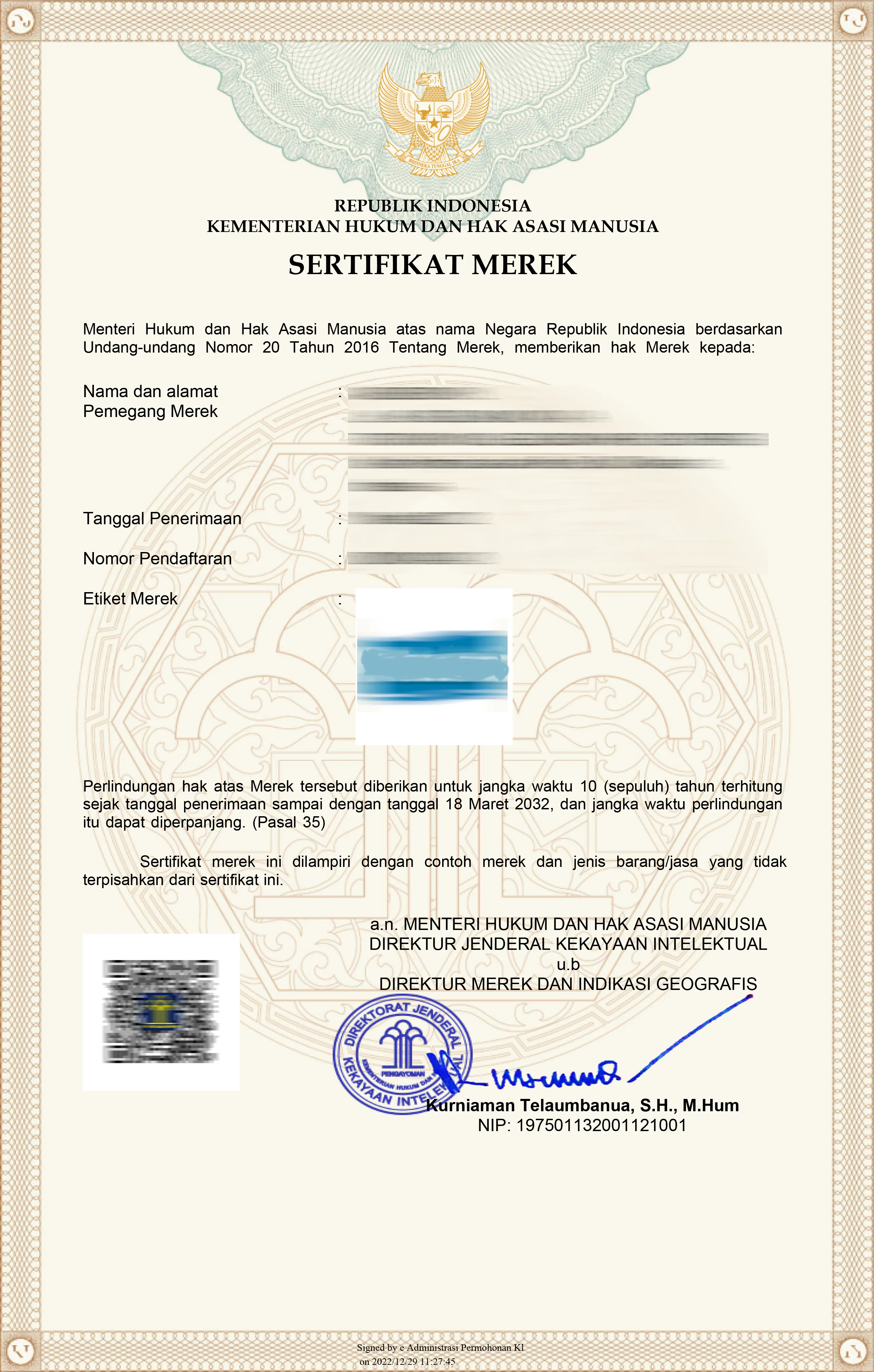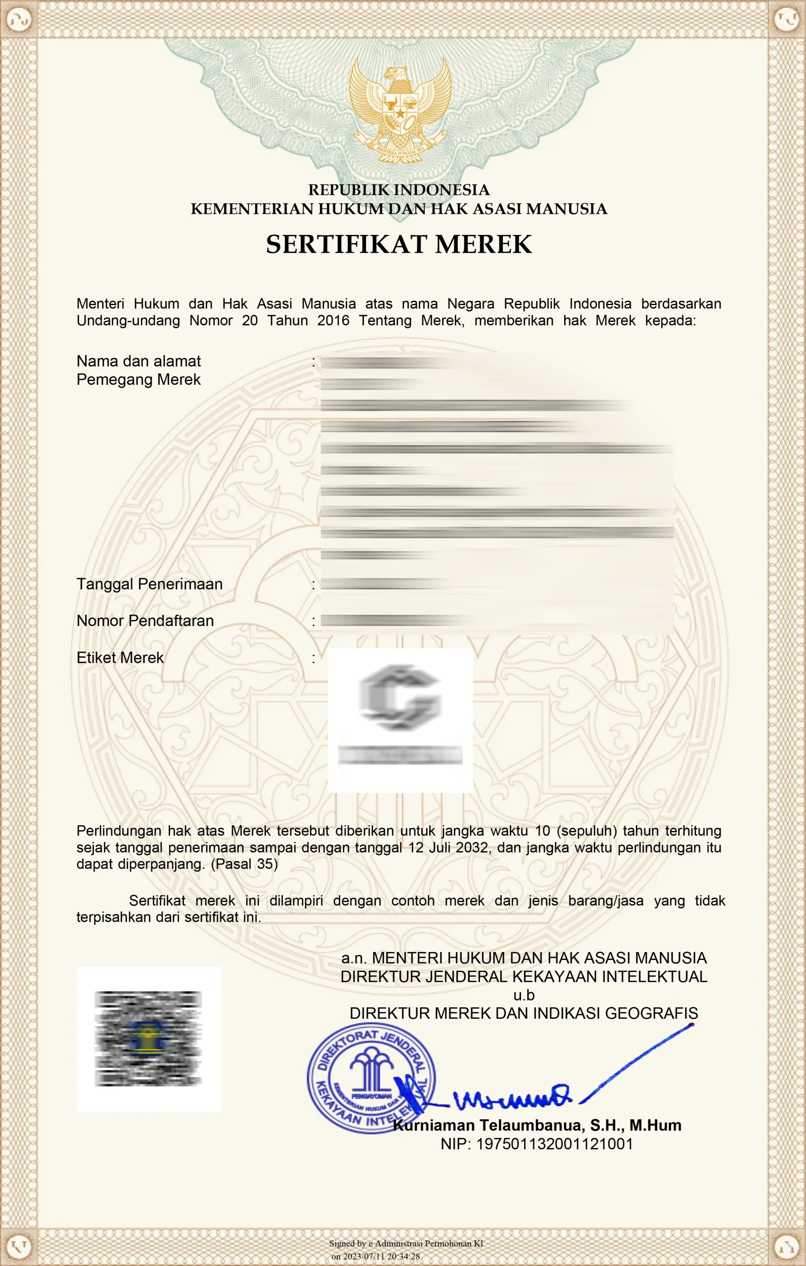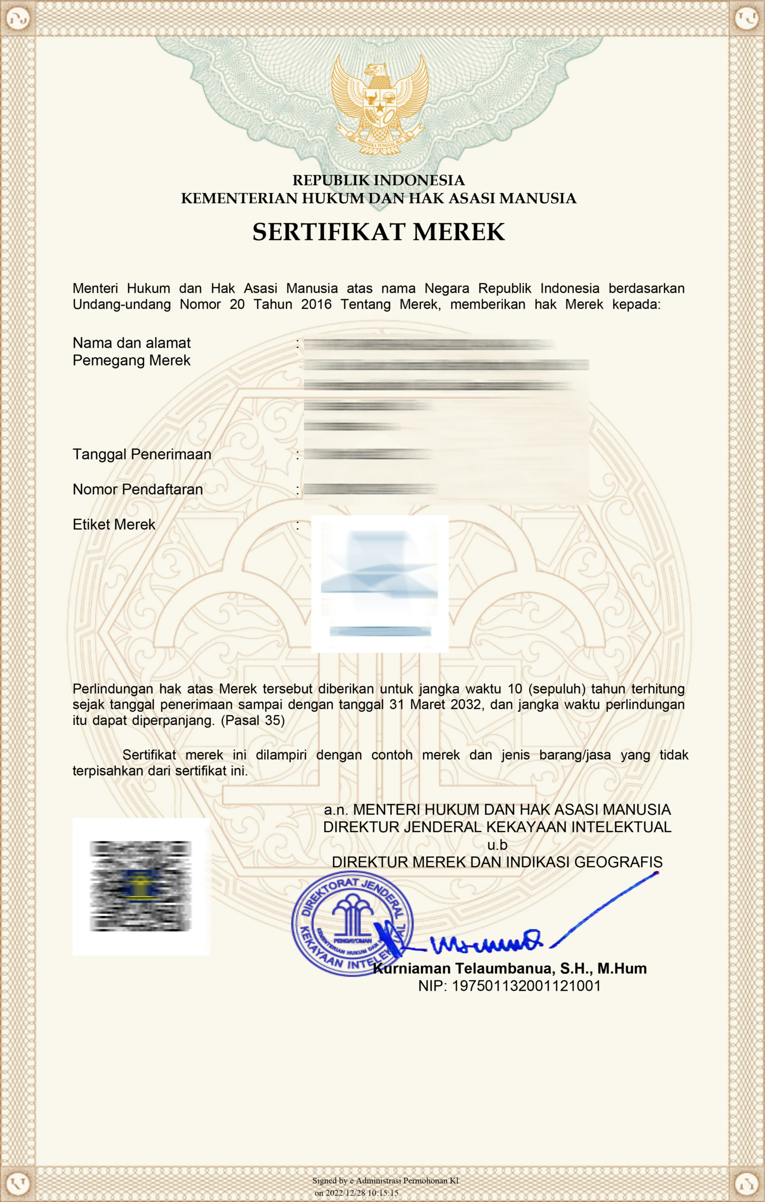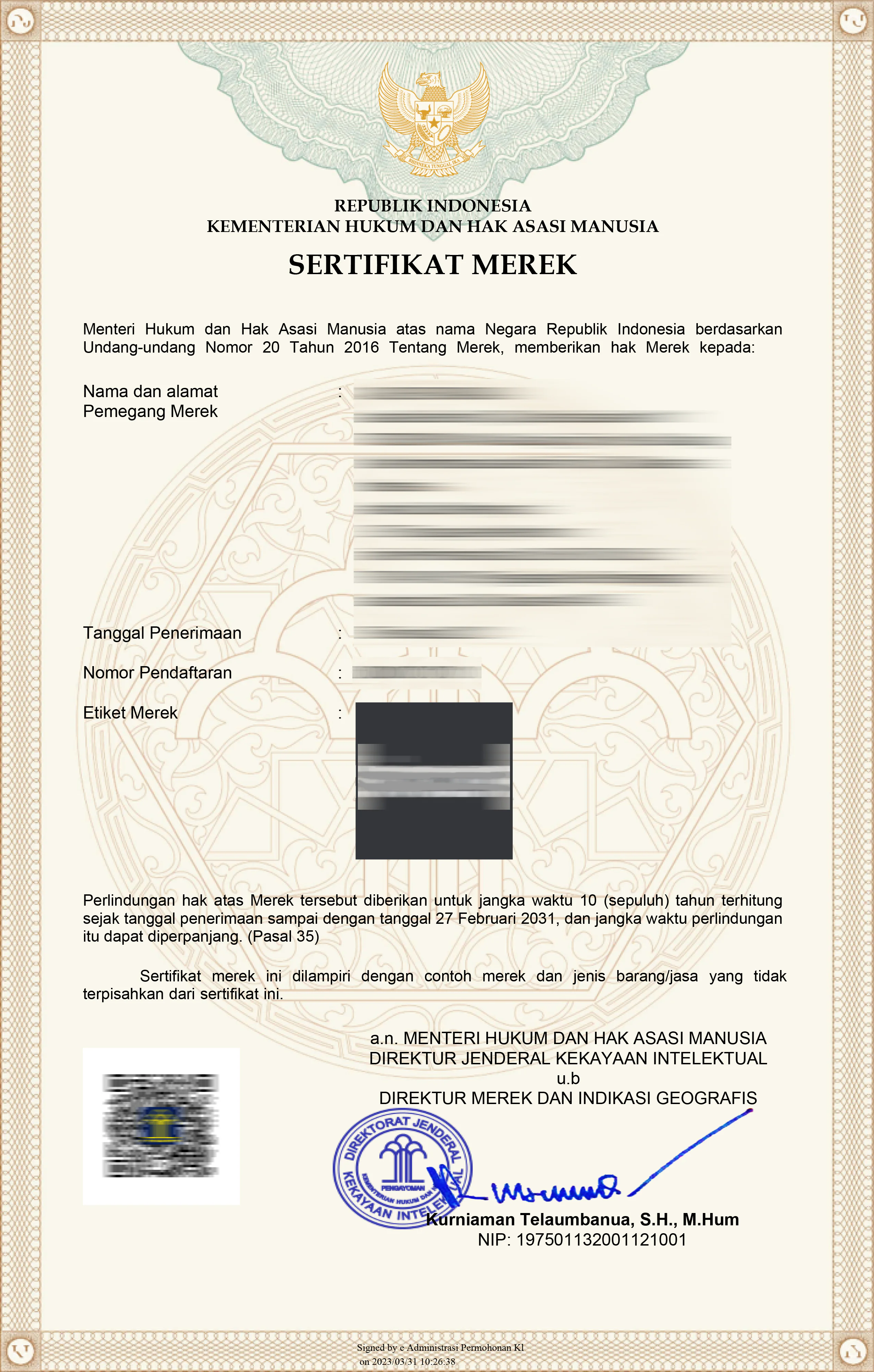 Biaya sudah termasuk pembuatan surat jawab kepemeriksa bila terdapat usulan penolakan. Serta sertifikat merek (kalau mereknya sudah terdaftar)